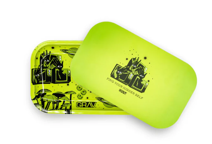 The GRAV Rolling Tray is crafted from sturdy metal and boasts a magnetic lid, ensuring your rolling supplies stay in place while you roll one up. This tray is available in two stunning designs. The first is the vivid chartreuse green illustration of a 90's psychedelic internet that will transport you to a nostalgic smoke session.